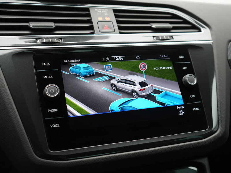 In één oogopslag heeft u alle benodigde functies onderweg in beeld, dankzij het slim ingedeelde digitale dashboard. Adaptive cruise control is een comfortabele en veilige optie. Het systeem reguleert de snelheid en houdt automatisch afstand tot uw voorligger. Had u de auto nou wel afgesloten? Met Connected Services checkt u het overal en altijd. Uw veiligheid op de weg wordt verhoogd door het audiosysteem met DAB-ontvangst en het navigatiesysteem te bedienen vanaf het stuur of met spraakbediening, zodat uw handen veilig op het stuur blijven en uw ogen gericht zijn op de weg. Kabelkluwens en stekkerslingers van smartphones zijn hier niet aan de orde. De draadloze oplaadmogelijkheid voor telefoons maakt opladen strak, simpel en snel. U bent in deze Volkswagen ook voorzien van achteropkomend verkeer waarschuwing, automatische airconditioning, schakelpaddles aan het stuur, parkeersensoren voor en achter, regensensor en keyless entry.