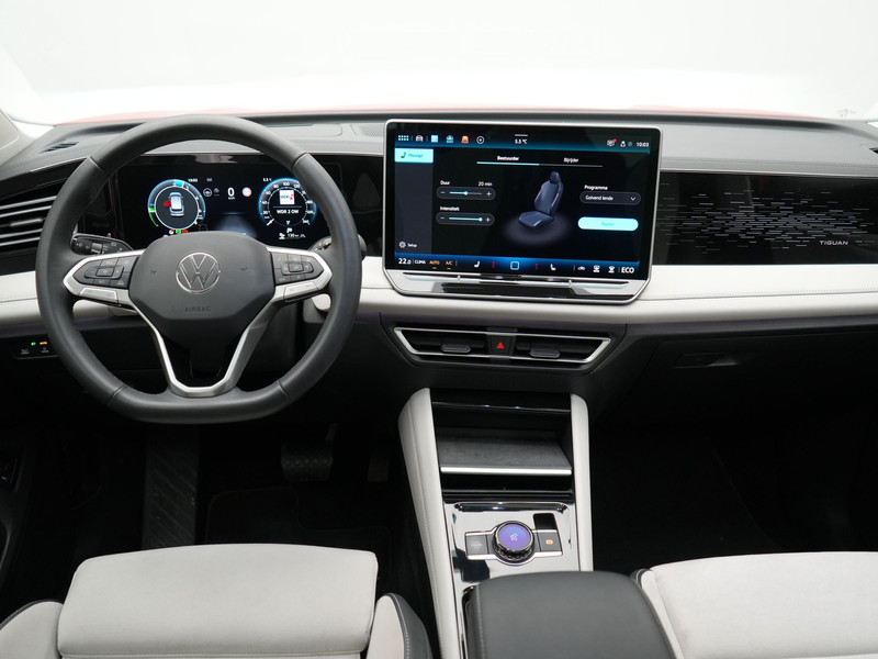 Rijden als nieuw? Dan is deze Volkswagen Tiguan een fantastische buitenkans. Prille cijfers op de teller, piepjong ogend, verbluffend actueel in extra\'s en opties... Deze Volkswagen Tiguan heeft het allemaal! Het zijn de degelijkheid van de constructie en de doordachtheid van het ontwerp die ervoor zorgen dat een Volkswagen jarenlang begeerlijk blijft. Zoals deze Tiguan, bijvoorbeeld. Deze hybride auto beschikt over een verbrandingsmotor én een elektromotor. Daardoor rijdt de auto zeer comfortabel en is tegelijk zuinig in het verbruik. Ga samen met uw bijrijder lekker zitten in de verwarmbare voorstoelen en laat jullie bloedsomloop stimuleren door de massagefunctie. Voor het pittige uiterlijk én goed gesteund zitten zorgen de sportstoelen. Het interieur glanst in daglicht door het elektrisch bedienbare panoramadak. Met een druk op de knop gaat de elektrische achterklep open. Opvallend is de geavanceerde matrix LED-verlichting met daglichtkwaliteit. De koplampen dimmen automatisch het deel van de lichtstraal waar voor- of tegenliggers in rijden. De overige segmenten blijven aan en verlichten de weg maximaal. Ook 20 inch lichtmetalen velgen, adaptief dempingsysteem, warmtewerend glas, trailer assistent, LED-achterlichten en verstelbare lendensteunen zijn aan boord.