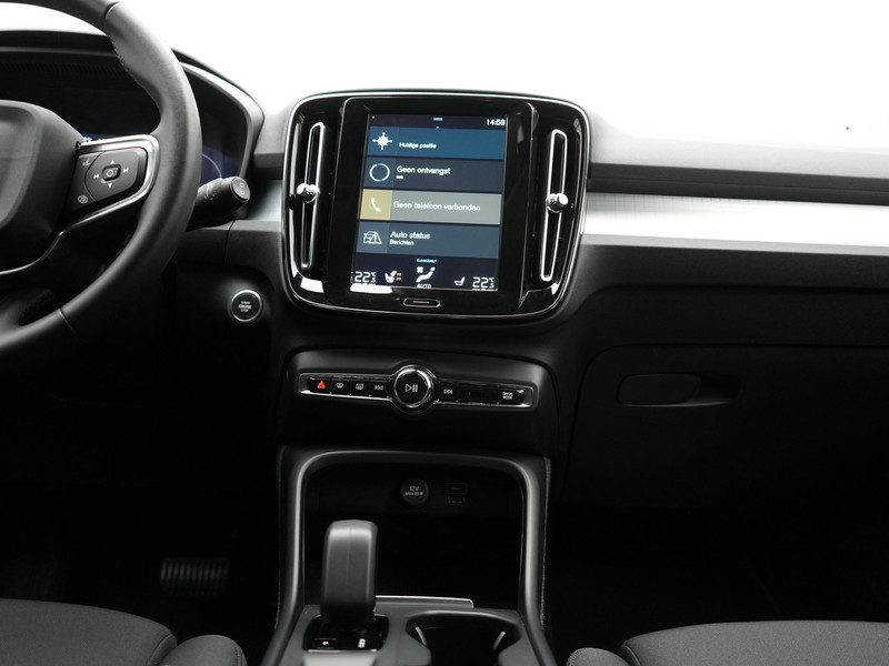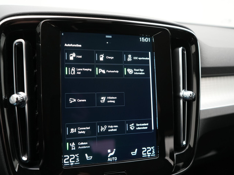 Zoals u mag verwachten van deze Volvo XC40 is hij uitgerust met een reeks aan actieve veiligheidssystemen. In het instrumentarium ziet u tijdens de rit ook de belangrijkste verkeersborden aangegeven, die de auto automatisch voor u leest. Het Lane-keeping systeem doet precies wat nodig is: waarschuwen en corrigeren bij onbedoelde overschrijding van de rijstrooklijnen. De actieve dodehoekdetectie draagt bij aan uw eigen veiligheid en die van uw medeweggebruikers. Verder is deze auto uitgerust met forward collision warning system, hill hold functie, brake assist, vermoeidheidsherkenning en bandenspanningcontrolesysteem.